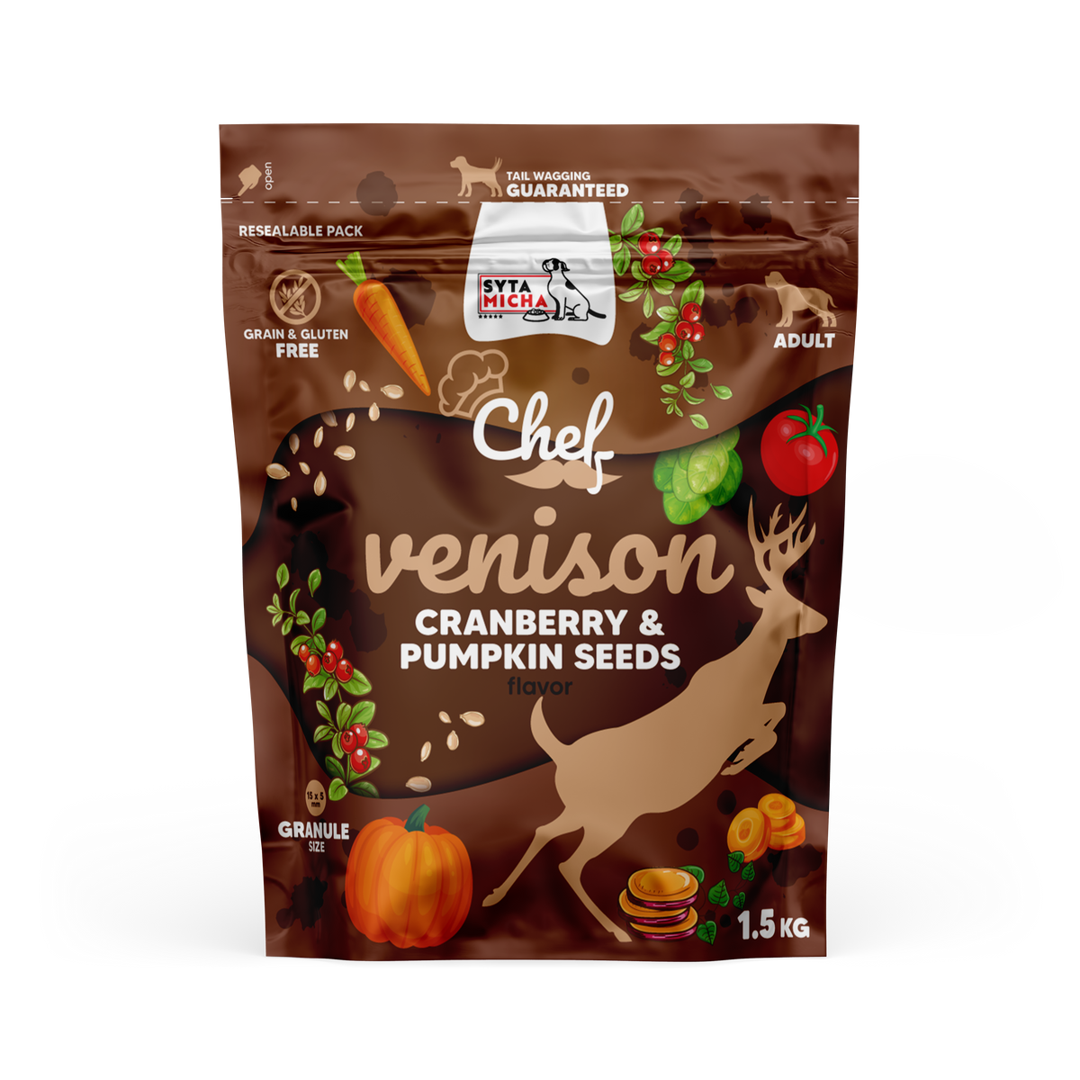 Syta Micha Carne di selvaggina, mirtilli rossi e semi di zucca è una formula senza cereali e completa per ogni cane adulto. È un pasto adeguatamente bilanciato, in cui al primo posto troviamo ben il 60% di carne di selvaggina, un'eccellente fonte di proteine, necessarie per mantenere la massa muscolare e un peso corporeo sano.