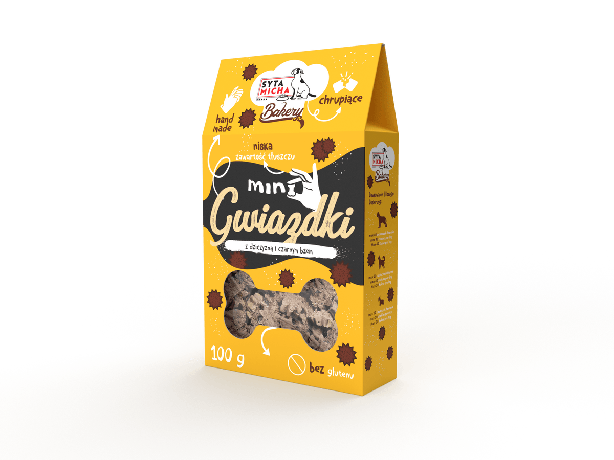 Міні зірочки — це ручної роботи, випечене печиво для собак. Надзвичайно хрусткі, дуже маленькі за розміром ласощі, склад яких базується на дичині, багатій на білок і залізо, та плодах чорного бузку, які є джерелом вітамінів C і A, мають противірусні та імуномодулюючі властивості.