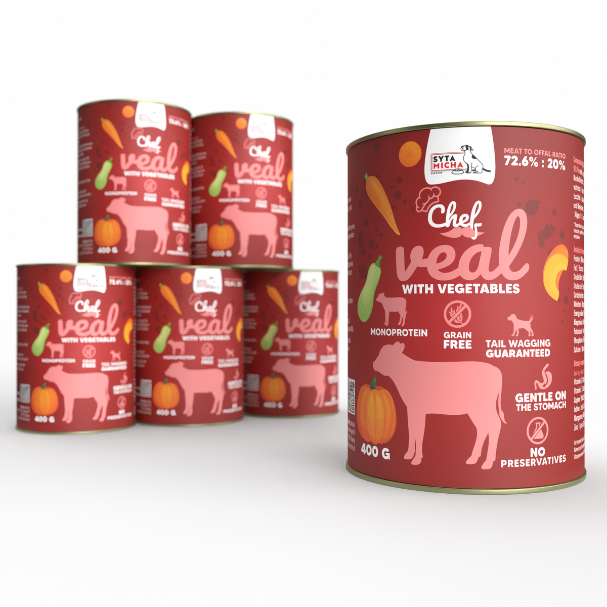 У лінійці Chef від Sytej Michy міститься до 92,6% продуктів тваринного походження, у співвідношенні 72,6% телячого м’язового м’яса до 20% телячих субпродуктів (10% шлунки, 5% серце, 5% печінка).